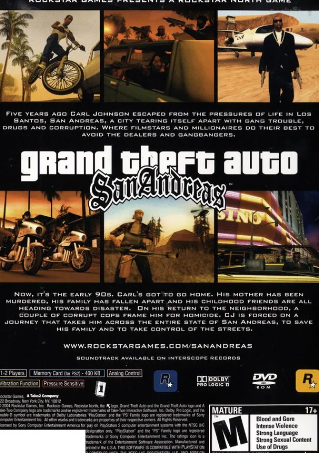 The follow-up to Grand Theft Auto III and Grand Theft Auto: Vice City. This time around, developer Rockstar North and publisher Rockstar take players to the state of San Andreas. Five years ago Carl Johnson escaped from the pressures of life in Los Santos, San Andreas… a city tearing itself apart with gang trouble, drugs and corruption. Where filmstars and millionaires do their best to avoid the dealers and gangbangers. Now, it’s the early 90s. Carl’s got to go home. His mother has been murdered, his family has fallen apart and his childhood friends are all heading towards disaster. On his return to the neighborhood, a couple of corrupt cops frame him for homicide. CJ is forced on a journey that takes him across the entire state of San Andreas, to save his family and to take control of the streets.