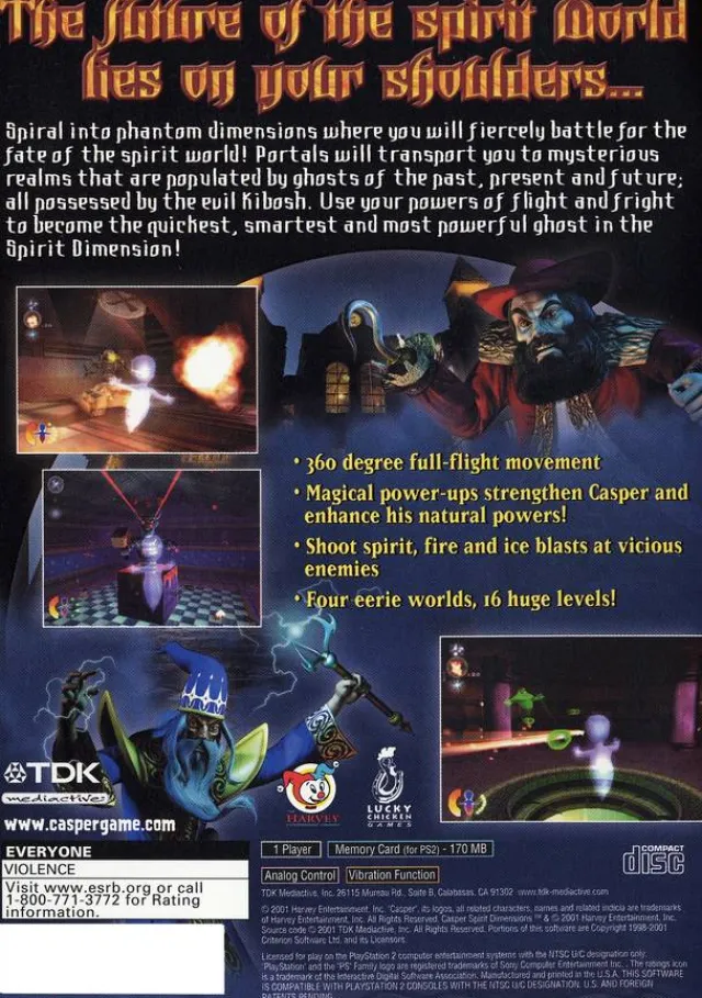 As Casper, the player faces his arch nemesis Kibosh and his evil minions in a head-to-head battle. Action sprawls across four worlds: a spirit world, an amusement park, a medieval world, and Kibosh’s factory. Each of the four worlds has four bosses. Players must use energy blasts and power-ups such as extra lives to dispose of these enemies. With intense action and graphics that take full advantage of the power of the PlayStation 2 console, Casper: Spirit Dimensions gives this classic character an edgy update.
