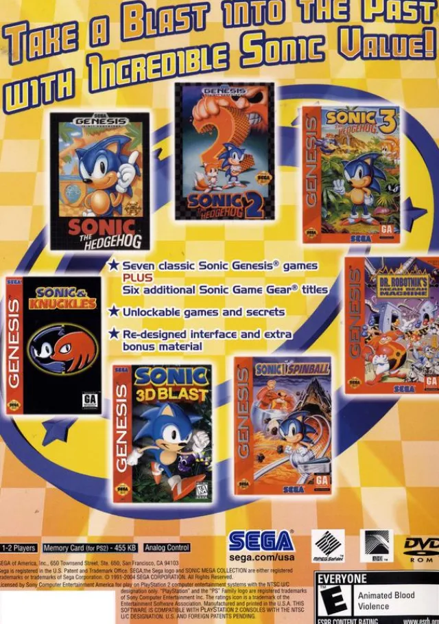 Sonic has appeared in many games in the last decade, and now you can relive seven of them from Sonic Mega Collection Plus.Loaded with hyper-speed ring collecting fun, Sonic Mega Collection Plus features SEGA’s mascot, and all his friends, in some of their greatest adventures. This classic compilation is a must have for long time fanatics and newcomers to the series alike, featuring seven Sonic The Hedgehog games from the SEGA Genesis, four additional unlockable Genesis games, six Sonic the Hedgehog SEGA Game Gear games, and a Sonic museum filled with art, comics and more.