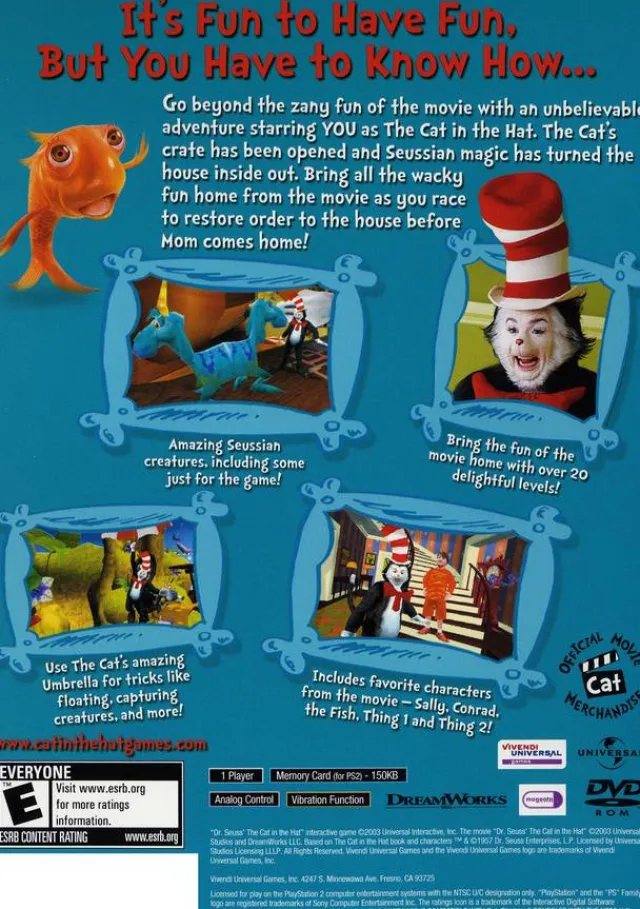 Go beyond the zany fun of the movie with an unbelievable adventure starring you as The Cat in the Hat. The Cat’s crate has been opened and Seussian magic has turned the house inside out. You’ll encounter all the wacky characters from the movie as you race to restore order to the house before Mom comes home. Jump, dodge and capture wacky Seussian creatures, including new ones created just for the game, in 20 wacky levels feature highly animated 3-D environments that capture the topsy-turvy movie world.