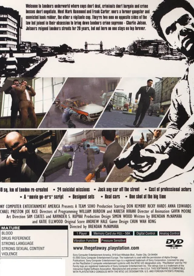 The Getaway for PlayStation 2 unleashes an ex-bank robber and a vigilante cop on a wild and action-packed hunt through London for the notorious crime boss Charlie Jolson. You’ll play Mark Hammond (an ex-bank robber on the run for murdering his wife and kidnapping his child) and Frank Carter (a vigilante cop who was suspended from the Flying Squad) in multiple storylines set in London. Within the city’s winding streets, indoor environments, and dangerous street corners, you must search for the manipulative crime boss and finally clear your name.