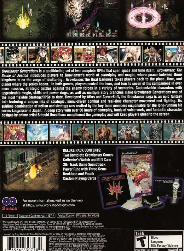 Growlanser Generations comprises two comprehensive RPGs, ‘Growlanser: The Sense of Justice,’ and ‘Growlanser: The Dual Darkness’, offering a captivating journey across time and space. The Growlanser saga is characterized by a blend of strategic, menu-based combat, and real-time character movement and combat. This combination creates a unique gaming experience steeped in rich storytelling and complex gameplay mechanics.