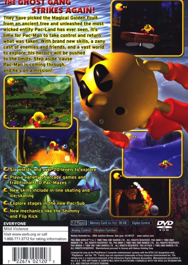 Pac-Man is on a brand new adventure and once again dealing with the pesky Ghost Gang. In Pac-Man World 2, the Ghost Gang has picked the magical fruit from an ancient tree, thereby releasing wicked evils upon Pac-Land. You must guide Pac-Man through six new lands with plenty of amusing surprises. New and improved, this Pac-Man can ice skate, rollerblade, submarine dive, and solve many exciting puzzles. With all-new moves and a zany cast of characters, your Pac-Man heroics will be pushed to its limits. PacMan World 2 brings challenging, fun gameplay for every age, regardless of whether you’re familiar with the classic original Pac-Man.