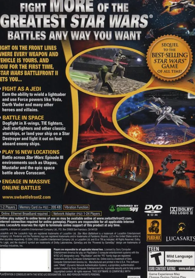 This sequel to Star Wars Battlefront improves upon its predecessor with a variety of gameplay enhancements, such as upgraded AI, more than 16 new battlegrounds, and greater story emphasis. In addition to the rebel, clone, and droid warriors from the original game, you can play as a Jedi, complete with lightsaber attacks and force powers. Enjoy an all-new single-player experience that takes players through an epic, story-based saga centering on Darth Vader’s elite 501st Legion of Stormtroopers where every action the player takes impacts the battlefront and, ultimately, the fate of the Star Wars galaxy.