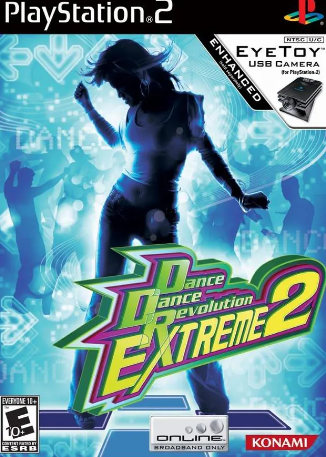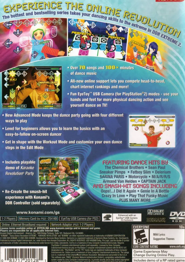 DDR returns on the PlayStation®2 computer entertainment system with popular artists, smash hit songs, EyeToy support and more unique modes and features than ever before. Dance Dance Revolution EXTREME 2 pumps up the volume with over 100 minutes of energetic dance music, including exclusively-licensed songs and dance hits, and for the first time on the PlayStation®2, the revolution goes online with multiplayer gameplay and online competitions. Customize your own dance steps in the Edit Mode All movies and cutscenes are newly created adding fresh flair to the DDR universe.