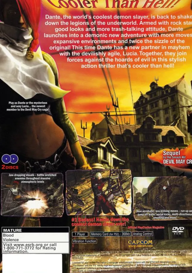 Uroboros is a company that began spreading throughout many countries aggressively with its many mining and construction companies. In order to proceed with its work it began buying up land that had many ancient ruins. Before long the company began to be criticized by the media and scholars for destroying landmarks, however, little did they know they were unleashing demons upon the world. Devil May Cry 2, the sequel to the gothic horror classic, features more and bigger environments, including a Gotham-like city and an old European town. There are now two playable characters–allowing you to play as Dante or a brand-new heroine, Lucia. Prepare for the next, stylish chapter of Capcom’s ultimate action thriller, Devil May Cry!