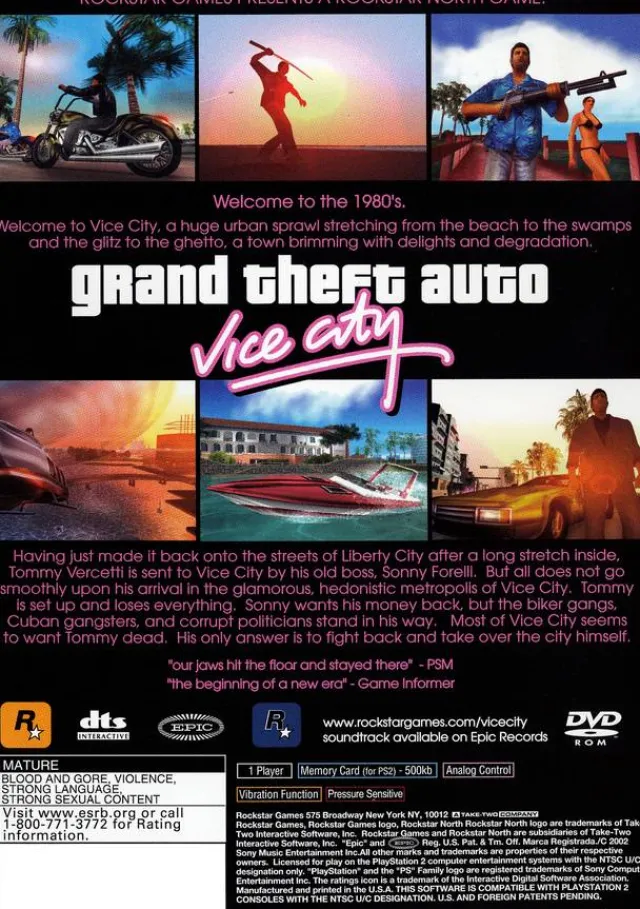 Having just made it back onto the streets of Liberty City after a long stretch in maximum security, Tommy Vercetti is sent to Vice City by his old boss, Sonny Forelli. They were understandably nervous about his re-appearance in Liberty City, so a trip down south seemed like a good idea. But all does not go smoothly upon his arrival in the glamorous, hedonistic metropolis of Vice City. With new sights, new characters, new business opportunities, and even a whole new ’80s themed era, players can indulge in more criminal fun than ever before. Vice City features more expansive locations, and over 120 vehicles ripe for the picking such as exotic cars, motorcycles, luxury yachts and planes.