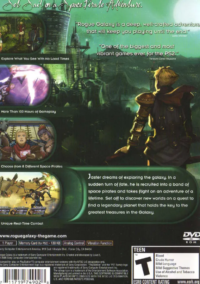 Rogue Galaxy is great fantasy role-playing where you follow a planet-hopping rogue for battle and adventure. At the far edge of the galaxy on the desert planet Rosa, a young man named Jaster dreams of journeying through space. He is recruited to join the crew of space pirate Dorgengoa in a race to find a legendary planet that holds the key to the greatest of treasures — eternal life Control up to three characters at a time, each colorfully brought to life within highly detailed environments. In addition to the compelling storyline, gamers will have access to multiple mini-games and be able to generate custom weapons and items by creating their own factory.
