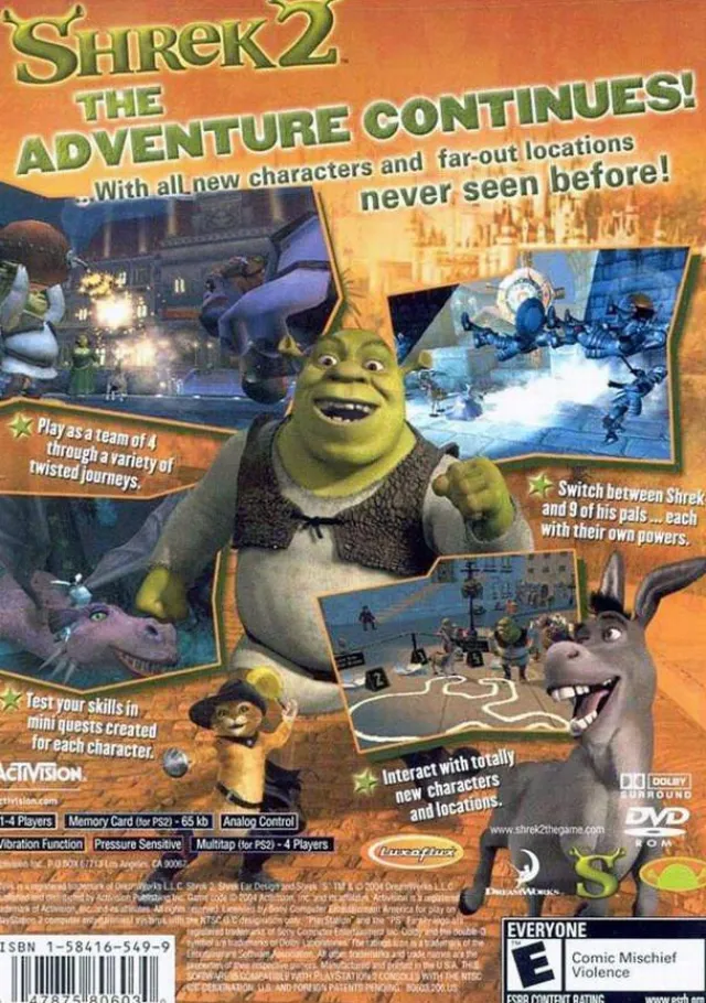 Shrek 2 takes players on a twisted fairy tale adventure with Shrek and his buddies. Revisit key locations from the movie sequel while discovering all-new locations and characters. Shrek 2 combines squad-based action with traditional action adventure elements. Players can control their team of 4 and play as Shrek or any of his 10 friends, switching between them to best utilize each character’s unique abilities to solve puzzles, fight monsters and complete wild and dangerous adventures.