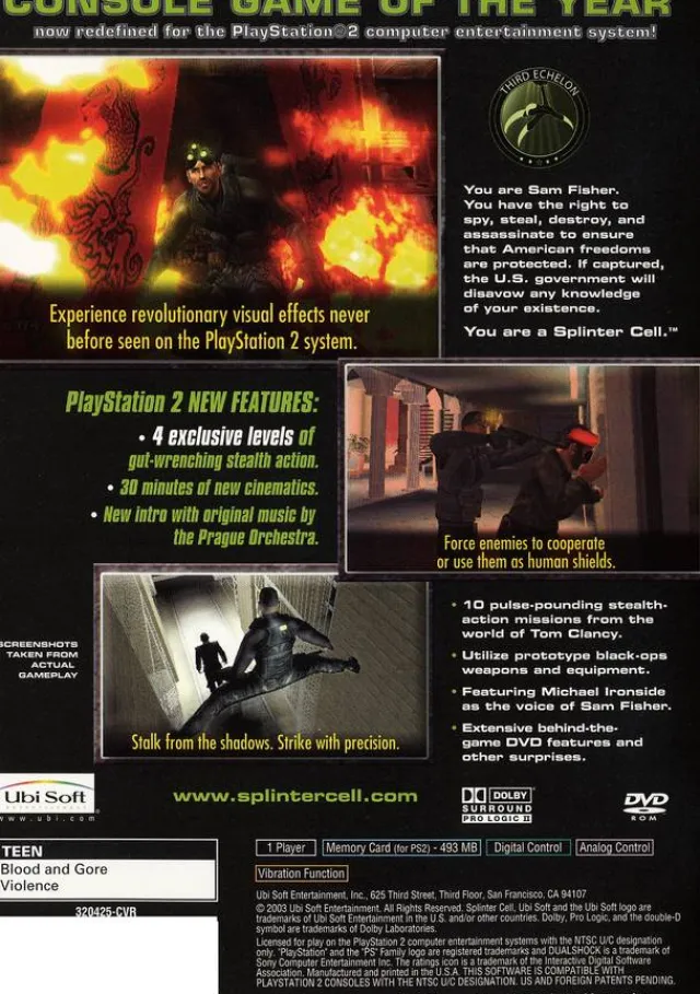 Tom Clancy’s Splinter Cell grants players access to the highest echelons of national security, where shadowy operatives have the freedom to do whatever it takes to safeguard America. The player controls Sam Fisher, a field operative of a secretive black-ops NSA sub-agency called Third Echelon. Sam Fisher is geared up to infiltrate high-security strongholds, seize critical intelligence, destroy threatening data, and neutralize the enemy–all without leaving a trace.