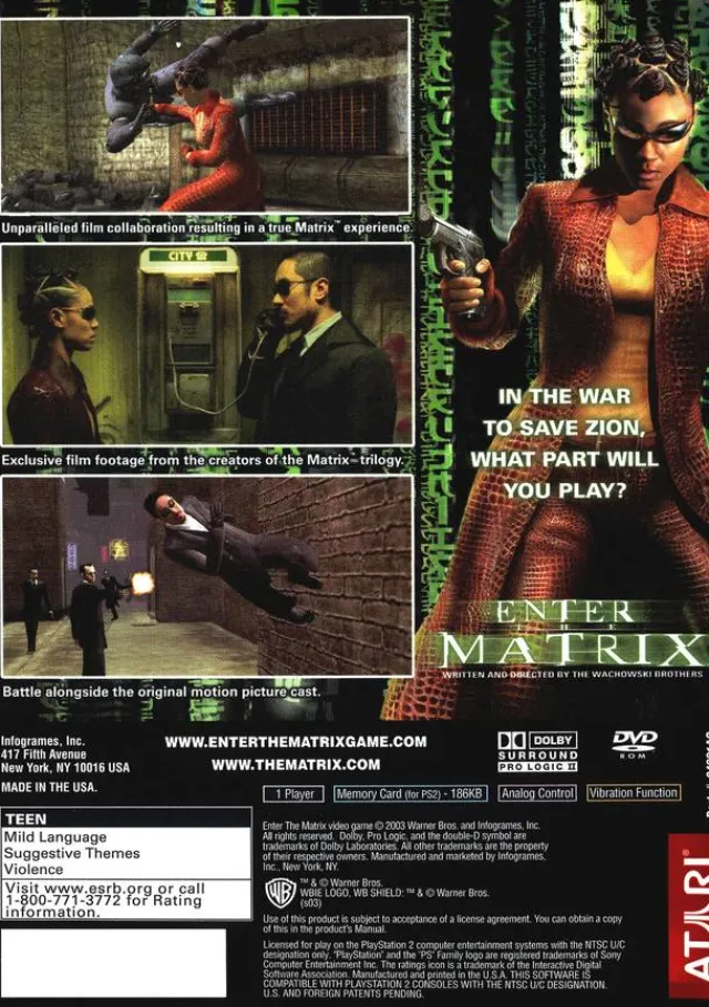 Taking place between the second and third movie in the motion picture trilogy, Enter the Matrix features a mixture of gunplay and martial arts that bends the rules. This game isn’t just set in the Matrix universe–it’s an integral part of the entire Matrix experience. Enter the Matrix is the story-behind-the-story and features slo-mo bullet time effects, never-before-seen live-action footage starring the cast of the movies, and plenty more.