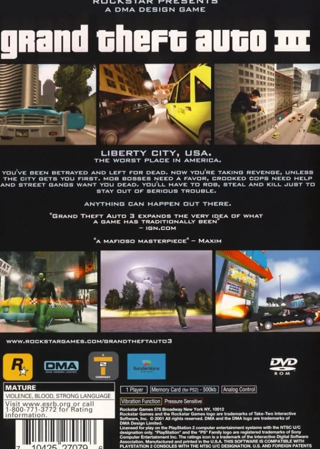 Welcome to Liberty City, America’s worst city. You’ve been betrayed. Now you’re taking revenge, unless the city gets you first. Mob bosses need a favor, crooked cops need help and street gangs want you dead. You’ll have to rob, steal and kill just to stay out of serious trouble. With a cast of hundreds, 50 plus vehicles, ranging from sports cars to ice cream trucks and from boats to buses, 3 hours of music, including opera, reggae, house, drum and bass, pop and disco, a huge array of street ready weapons and some of the seediest characters in video game history, Grand Theft Auto 3 is a sprawling epic which will show you that sometimes, crime can pay and sometimes it can pay you back.