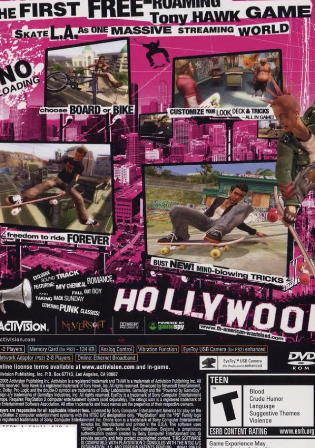 Tony Hawk’s American Wasteland gives players the freedom to experience continuous skating and BMX biking action without leaving the game or waiting for load times as they explore and choose missions in a massive, living Los Angeles skate world. The cash that you earn can be used to customize your equipment and your skater by going to tattoo parlors and skate shops. Tony Hawk’s American Wasteland also includes a classic mode that features classic Tony Hawk Pro Skater maps and objectives.