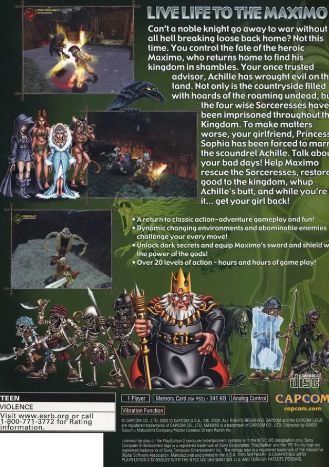 After fighting in a war, the young knight Maximo returns home to find his kingdom in shambles. Not only is the countryside filled with the undead, but the four wise Sorceresses have been imprisoned throughout the Kingdom; and to make matters worse, his girlfriend, Princess Sophia, has been forced to marry the scoundrel Achille. To aid him, Maximo wields more than 40 special abilities, moves, and power-ups with thanks to a flexible character customization system, while using his sword, shield, and wits to defeat a variety of different enemies. Help Maximo rescue the sorceresses, restore good to the kingdom, and whip Achille’s butt. And while you’re at it, get your girl back!