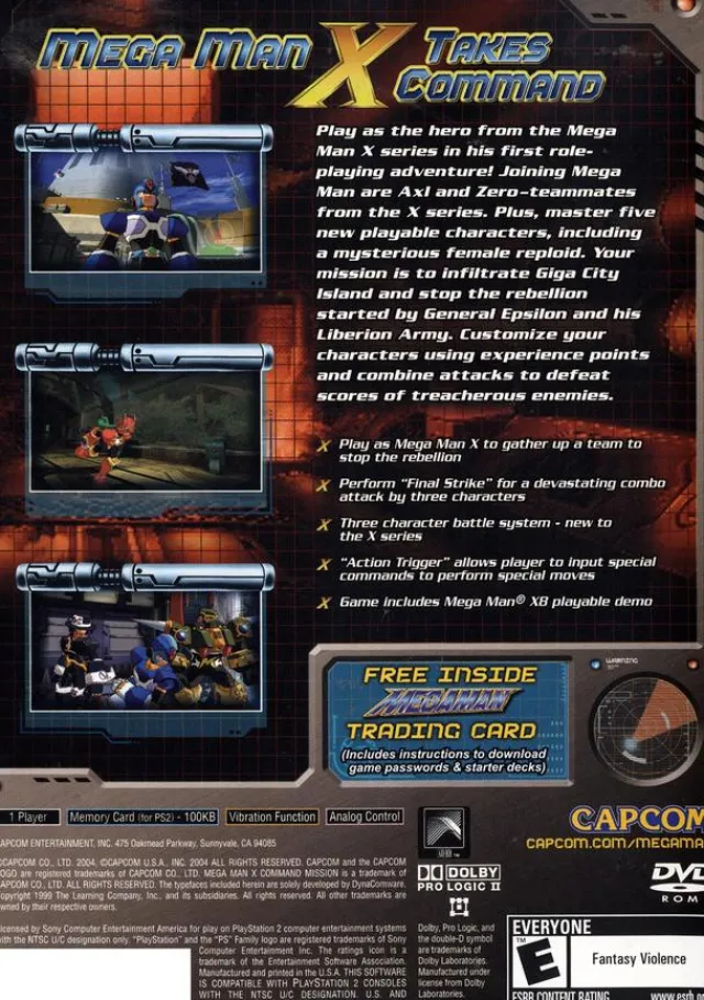 Mega Man X Command Mission takes the blue bomber franchise in a whole new direction by introducing it to the role playing game (RPG) genre and producing an exciting new title set within the Mega Man X universe. Your mission is to infiltrate Giga City Island to stop the evil plans of the rioting Liberion Army. Choose from seven playable characters including Mega Man, Zero, and Axl, and team up to use three-member attacks. With fundamental Mega Man characteristics, cel-shaded characters and true 3-D stylized environments, Mega Man X Command Mission is sure to please fans and gamers new to the franchise.