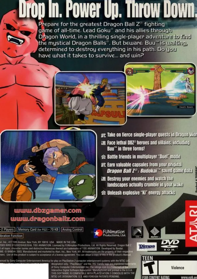 Go beyond the Dragon Ball Z sagas and experience a new way to battle with the most powerful fighters in the universe. dragon Ball Z: Budokai 2 improves upon the first installment by adding an all-new single player mode, new characters and explosive attacks. Experience character cameos and challenging missions in “Dragon World” that opens the story to new character match-ups. You can also battle your friends in multiplayer “VS.” and “Tournament” modes. If your will and skill prevail, you will come face-to-face with Buu, the most lethal of all DBZ villains. Do you have what it takes not only to survive, but to dominate?