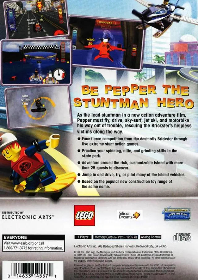When movie moguls choose LEGO Island as the location for a new action adventure film, naturally they pick you, Pepper Roni, to be the lead stuntman, but you have to deal with mischevious Brickster. The villain was recently released from jail after he claimed to have reformed and is now playing a part of the film. Drive, fly, jump, and skate through five extreme stunt games that take you all over the vast LEGO Island. Dash from shoot to shoot on your skateboard or in any one of the vehicles – providing you’ve passed the test of course!
