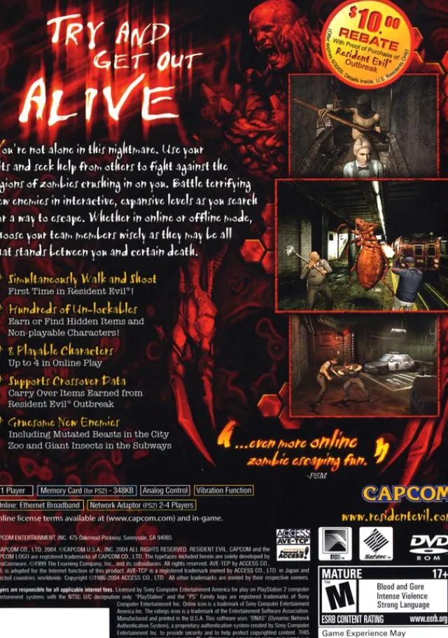 Continuing the dramatic story of an epidemic caused by a secret biological weapon infecting the people of Raccoon City, Resident Evil Outbreak File #2 brings longtime survival horror fans back into the world of online terror. Citizens are turning into flesh-eating zombies and swarming the streets, while only a few desperate survivors remain. Discover the truth behind the T-virus outbreak by exploring five new locales, including a zoo, the subway, and the police station. Like its predecessor, Resident Evil Outbreak File #2 features an online cooperative mode for up to four players.