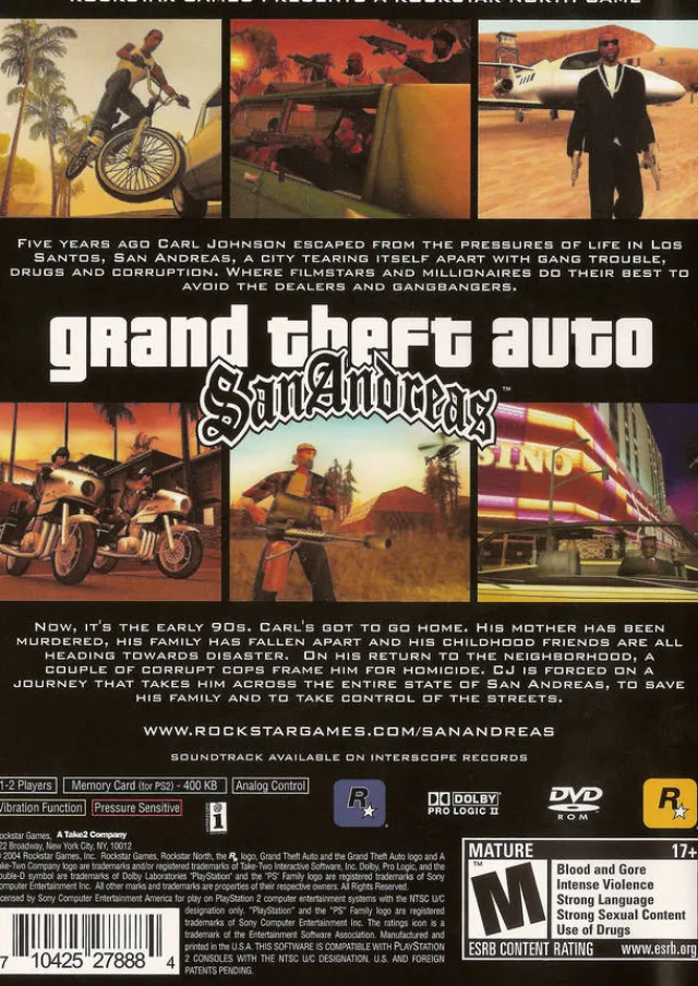 The follow-up to Grand Theft Auto III and Grand Theft Auto: Vice City. This time around, developer Rockstar North and publisher Rockstar take players to the state of San Andreas. Five years ago Carl Johnson escaped from the pressures of life in Los Santos, San Andreas… a city tearing itself apart with gang trouble, drugs and corruption. Where filmstars and millionaires do their best to avoid the dealers and gangbangers. Now, it’s the early 90s. Carl’s got to go home. His mother has been murdered, his family has fallen apart and his childhood friends are all heading towards disaster. On his return to the neighborhood, a couple of corrupt cops frame him for homicide. CJ is forced on a journey that takes him across the entire state of San Andreas, to save his family and to take control of the streets.