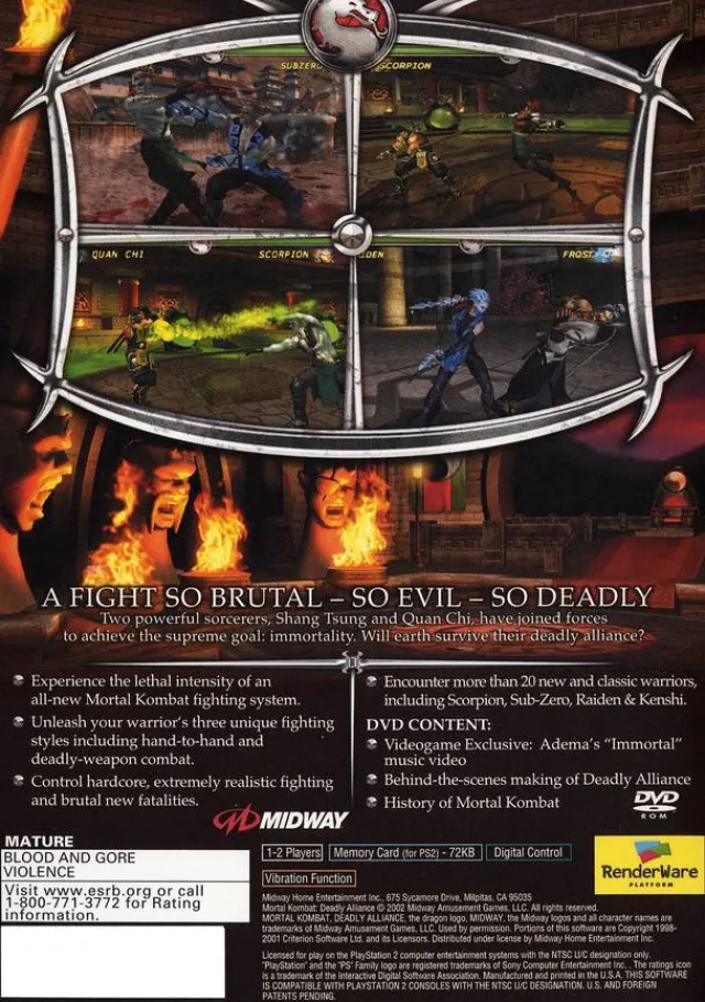 From the franchise that shocked the world and revolutionized the fighting game category, Mortal Kombat: Deadly Alliance enters the 21st Century with an all-new fighting system, an in-depth, supernatural storyline and infamous brutal fatalities that push the limits of all the next-generation console systems. Beginning the next chapter in the battle of good versus evil, two powerful sorcerers–Shang Tsung and Quan Chi–join forces to deliver unrivaled fighting action in their quest for supreme mortality.