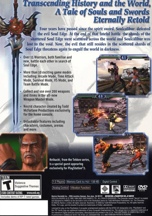 After the ancient sword called Soul Edge was broken to pieces, the shards were scattered across the world. The mighty weapon that destroyed it, Soul Calibur, has since disappeared — and the evil magic of the sword has begun reasserting itself. Open the next chapter in world of Soul Calibur. Soul Calibur II features seven distinctive gameplay modes including: Arcade, Versus, Time Attack, Survival, Team Battle, Practice, and the console exclusive Weapon Master. Become any of the warriors from the original monster hit, or two new characters, as you seek the fragments of Soul Edge and the secret of Soul Calibur’s disappearance.