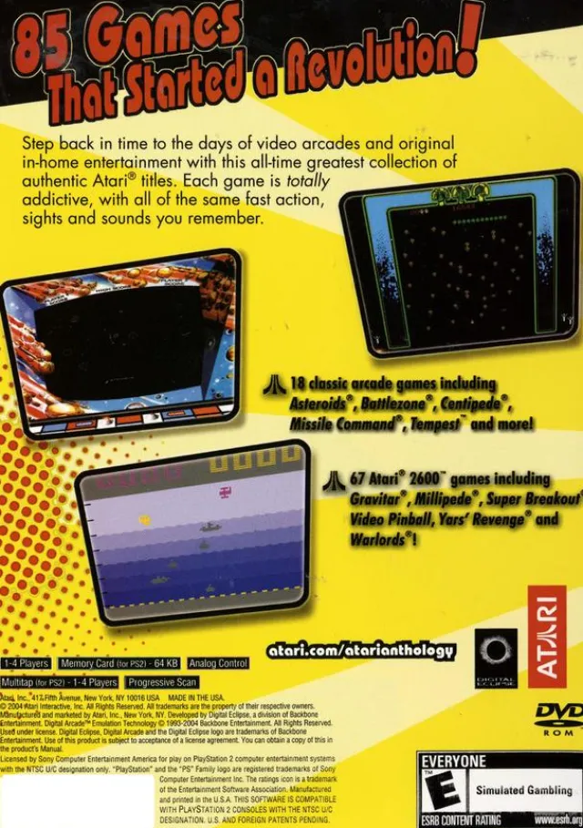 Get back to your gaming roots with 85 games that helped start the videogame revolution, all faithfully reproduced in Atari Anthology. Eighteen classic arcade titles include some of the most addictive games ever, like Asteroids, Battlezone, Centipede, Missile Command, Tempest, Warlords, Pong, and Crystal Castles. Five bonus games, unseen since the 1980s have been included as well: Steeplechase, Off the Wall, Blackjack, Desert Falcon, and Sprintmaster. Relive your favorite titles from the early days of video games, and take on new challenges and bonus games.
