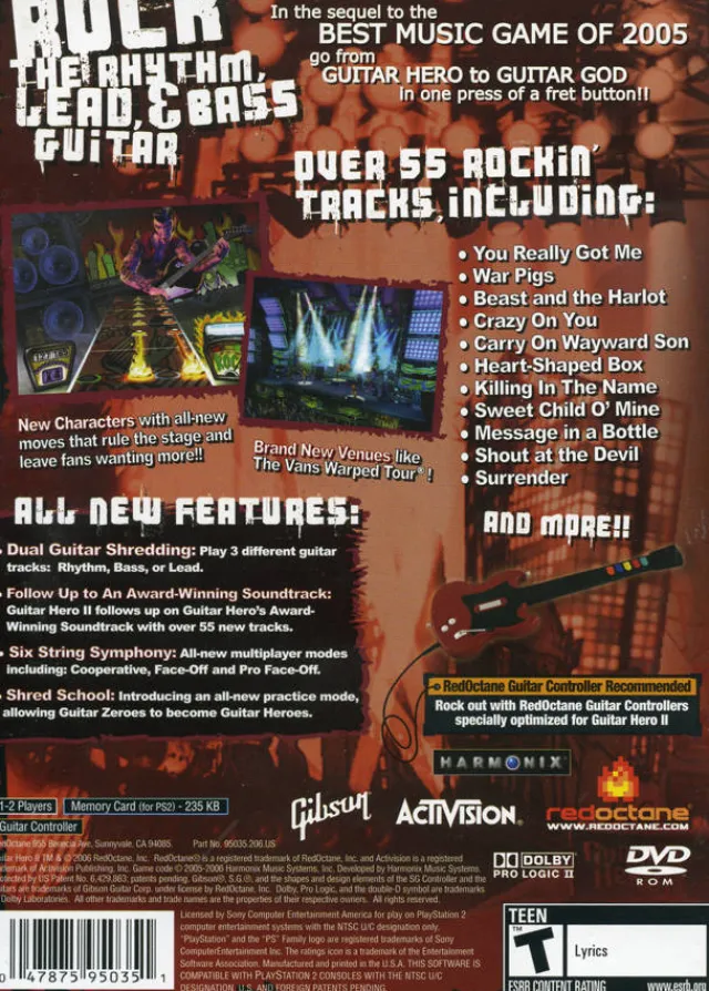 Rock the Rhythm, Lead, and Bass Guitar tracks in the follow-up sequel to “Guitar Hero.” Form your guitar duo and shred riffs cooperatively or go head to head in all new multiplayer modes. Guitar Hero II features a huge track list, more venues and new play modes than in the original game, and a goal to rock longer and harder than its predecessor. With over 55 tracks to rock out to, you’ll go from Guitar Hero to Guitar god in one press of a fret button.