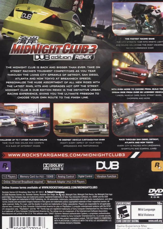 The Midnight Club is back and bigger than ever. Midnight Club 3: DUB Edition Remix features all the cities, cars and music from Midnight Club 3: DUB Edition while adding entirely new content with 24 new vehicles, a new city (Tokyo), new music, new races and battle maps. Personalize the huge assortments of all new additional rides with the latest rims, kits and upgrades hot off the street. Midnight Club 3: DUB Edition Remix is the definitive urban racing experience, giving you the ultimate freedom to choose your own route to the finish line.