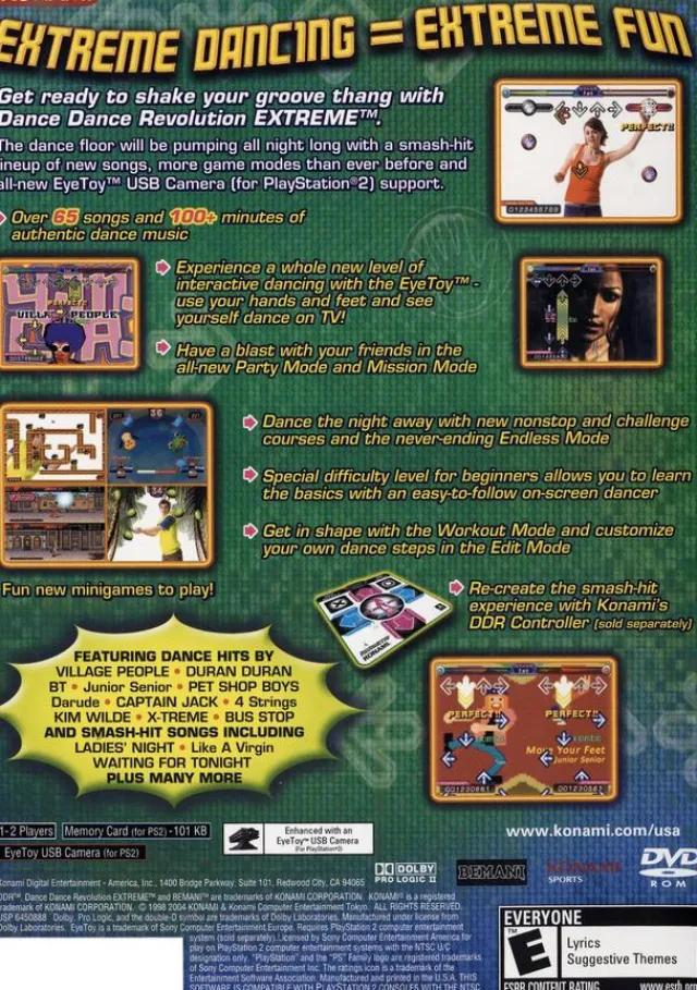 Become an extreme dancing machine with the most advanced Dance Dance Revolution yet! You’ll be moving more than just your feet in Dance Dance Revolution Extreme, which features new songs, game modes, and EyeToy functionality. Now you can become physically part of the game with EyeToy, which challenges players to use both their hands and feet in more intense dancing action. Experience the biggest dance hits, new songs, new game modes and all-new surprises. The next revolution is about to begin!