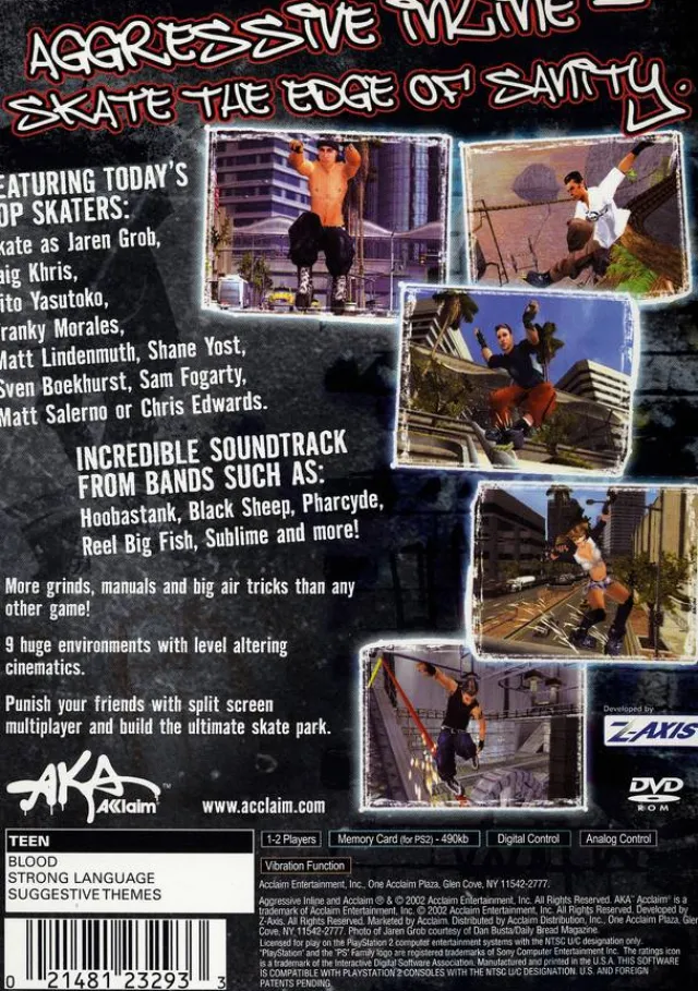 An extreme sports title that centers on inline skating, Aggressive Inline features seven massive levels, a comprehensive stage editor, and a licensed soundtrack. You can choose from an array of professional inline skaters–including Jaren Grob, Chris Edwards, and Shane Yost–and showcase your talent in various interactive skate parks. Perform a variety of manuals, grinds, big-air tricks, wall flips, hand plants, and more, to build up your Juice Meter and avoid elimination.