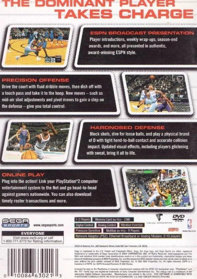 NBA 2K3 powers forward with the kind of improvement that only results from an off-season dedicated to perfection. Imagine jump shots so real players actually adjust their movement in mid-air, based on distance from the hoop and defensive pressure; a passing touch that gives you the control to skirt a defender or air-out a fast break; dribble moves that let you jab left, rock right, crossover, and spin; and much more. No other game delivers the physical element of basketball like this: accurate impact from collisions, especially hard fouls and authoritative dunks; shot blocking with emphasis on precise hand-to-ball contact; and the ability to lunge for the loose ball, even if it means ending up on some celebrity’s lap.