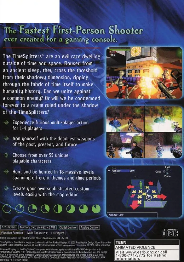 Time Splitters was developed by the creators of the revolutionary first-person shooter Golden Eye 007. The plot centers on the Time Splitters, an evil race that exists outside of time and space. Battling in three different eras (1935-1955, 1985-2000, and 2015-2035), you must destroy the aliens and restore the timeline. There are 24 unique playable characters and levels, plus over 20 weapons from which to choose. The separately sold Sony Multitap accessory allows four gamers to battle it out in multiplayer scenarios. Create even your own Deathmatch levels by using the mapmaker editor.